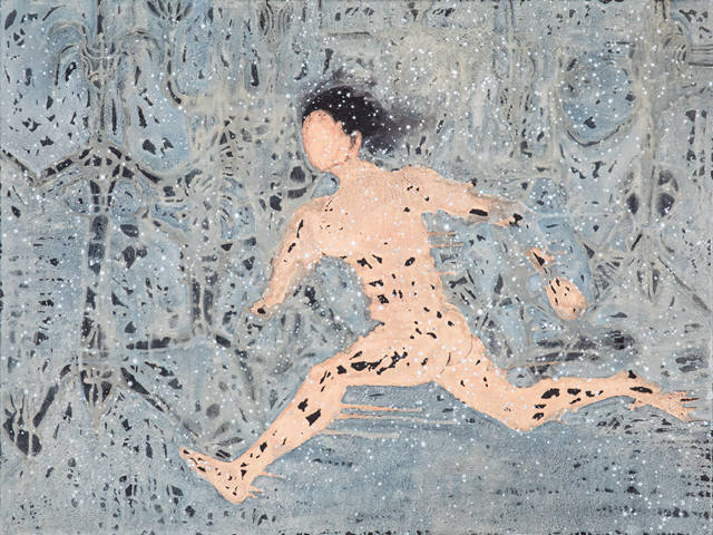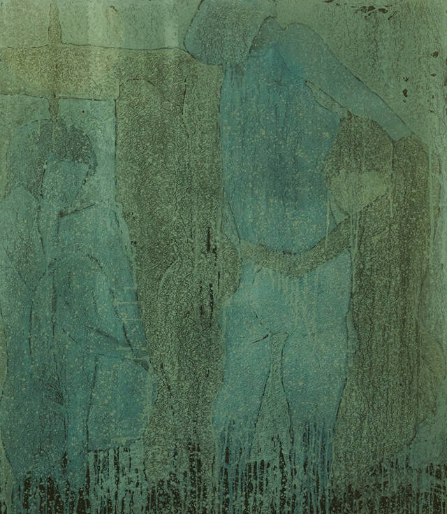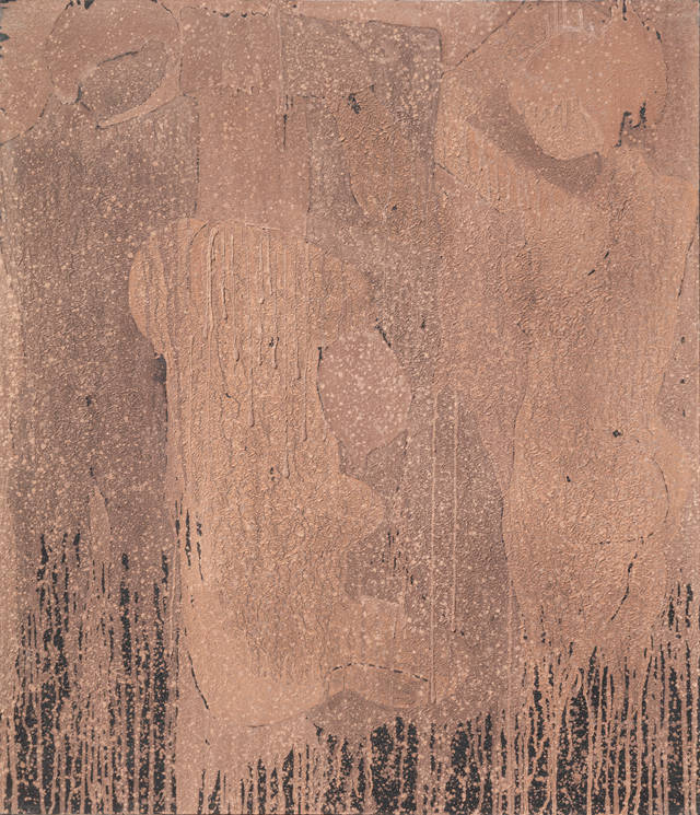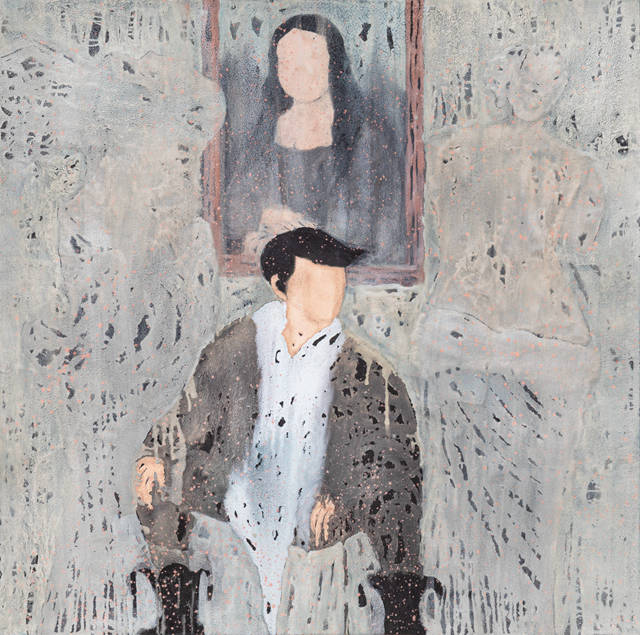 老子思想中的“两者同出异名”,是指“有和无其实出自同一根源,只是称谓不同”。这意味着作家在作品中意图展示的人物背景既有也无。连接有和无的符号正是表达“流动技法”的“线”(line)。大部分作品中,“线”或表达速度感,或表达方向性,或发挥平衡性作用,但在这里表达的时间性更为加强烈。从过去到现在的流动,就是表达时间的“水平线”或“垂直线”。因此,通过这条“线”,可感受到同一时代性。它让人们忘记了对作品主题来源的疑问,共享了此时此刻共聚同一空间的时间性。作家将石彩的水流升华为“线”。