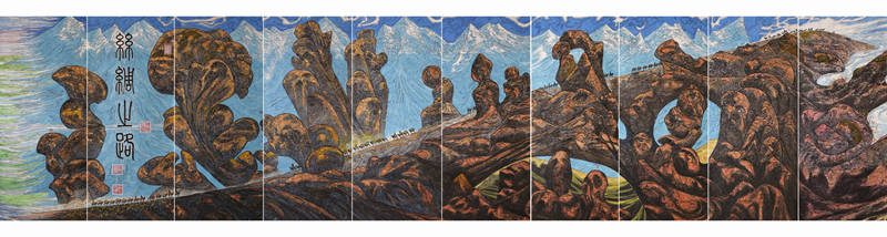 《中华江山图》是一幅延续了五千年文明的中华母亲的素稿,是祖国母亲的面貌,它涵盖青藏高原、茶马古道、天府之国、江南、长江、黄河、丝绸之路、中华长城、关东、地下山河、万里海疆等十二个大段及喜玛拉雅、昆仑、天山、黄土高原、长城、长白山、台湾海峡等一百五十九个小段。
