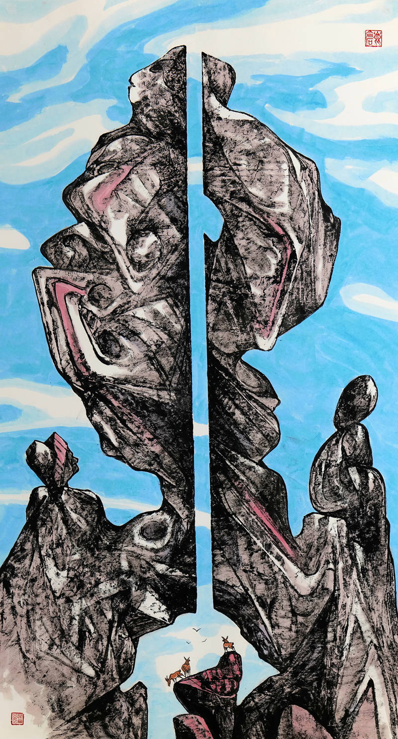 我认为一个好的能够推动大家的作品,一定具备两级的东西。就金老先生现在的一级就是扎实的地质地貌,反而让我感觉他的画里透露的专业性的东西多了。第二我建议金老先生他这个根基反而要向相反走,就是非专业。我觉得老先生其实挺认真的,你本来有这个因素了你就赶紧要加入这个因素,加入这个因素以后就会增加能量场。我感觉到能量,那么他这个能量你说不清,但是这个能量一定是金老先生把非专业性的东西要增加出来,就是太多他擅长的东西增加进来。