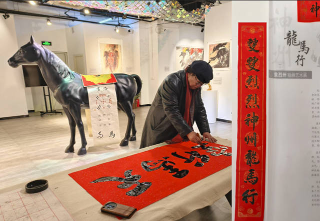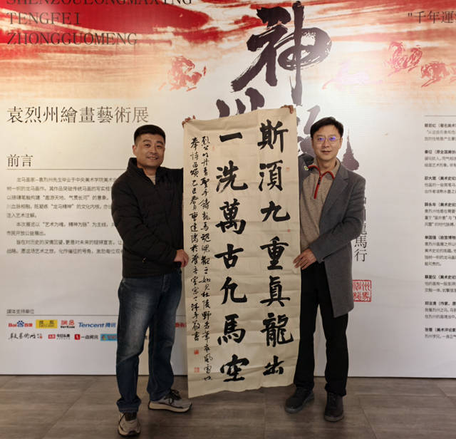 天津孔孟书画院长、书法家孟昭良先生,是亚圣孟子的第七十一代传人,来观看龙马画展,感受到画中的“浩然正气”,现场激情挥毫,写下 “天马行空”“万马奔腾”和“轰轰烈烈神州龙马行,郁郁葱葱天地正气扬”的书法对联祝贺画展圆满举办。