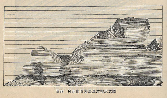 页岩:亦称粘土岩,常含粉砂质。轻微变质后常具页片状构造,称为页理,其特别发育时就象纸片一样薄,易于剥离。甘肃北山中生代地层中常见到纸片状页岩。黄土:质轻而疏松多孔。常发育有垂直的柱状节理,所以能形成陡崖,如我国黄土高原。
