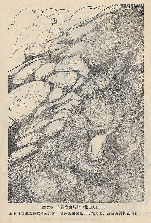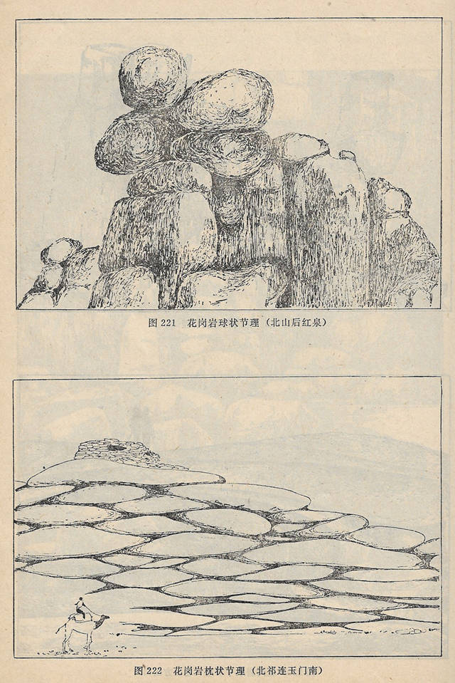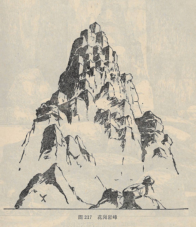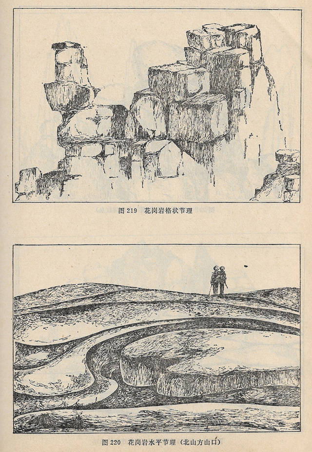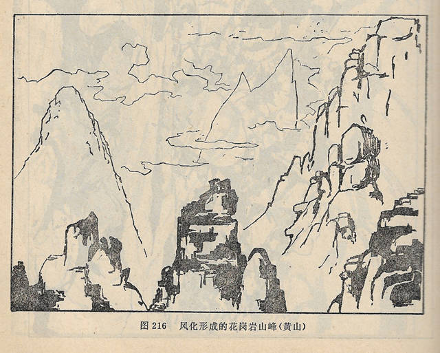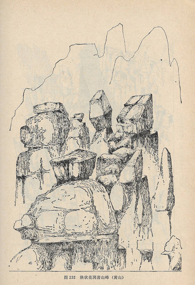 花岗岩,由于节理、裂隙发育,风化多成悬崖、异峰地形,在崖下的山往往集聚碎石、岩块,形成岩块堆积。节理不发育的花岗岩风化后常形成馒头山和石蛋地貌。