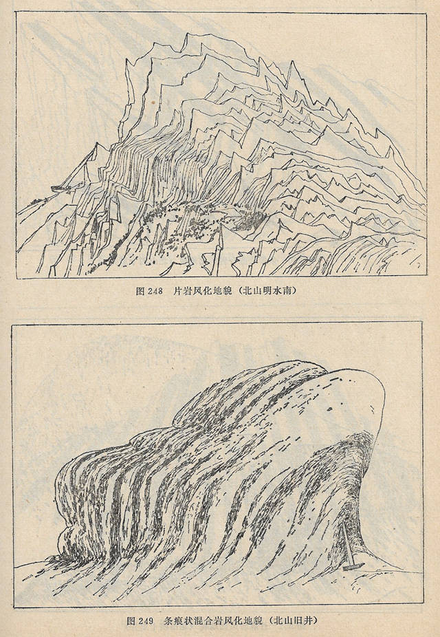 坚密的变质岩地区风化地形特征是:山顶尖锐,山脊狭窄。结晶片岩页岩组成的地形,往往形成赤露的山坡,山脊向着片理或层理倾斜方向倾斜,造成复杂的状地形。