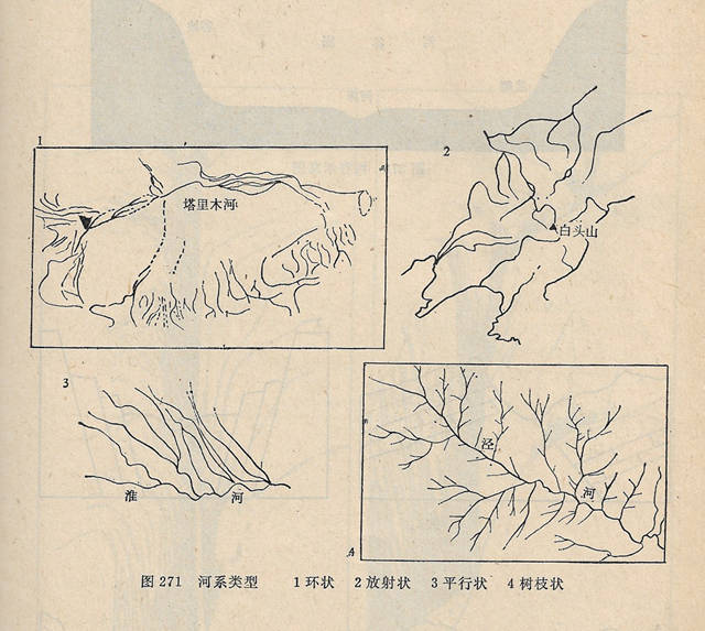河系类型:河系的类型与地质构造和岩性有着密切的关系,可分树枝状、羽毛状、平行状、格状、放射状、环状等。