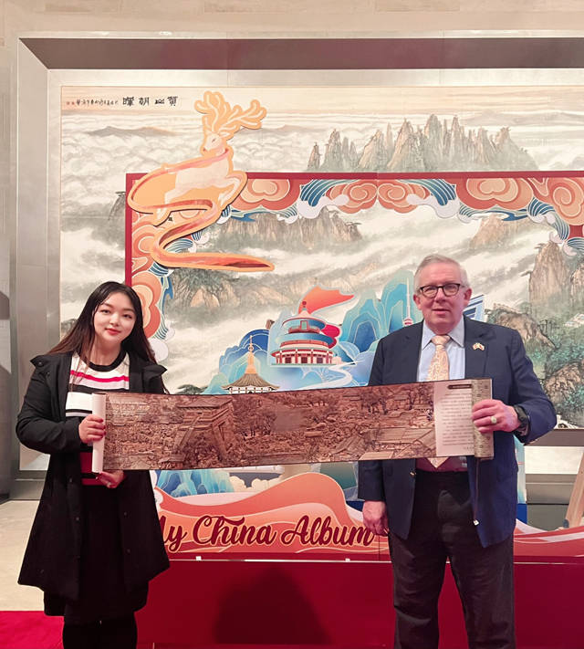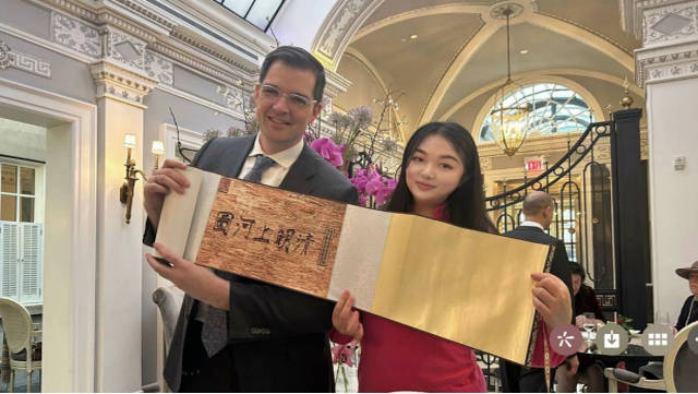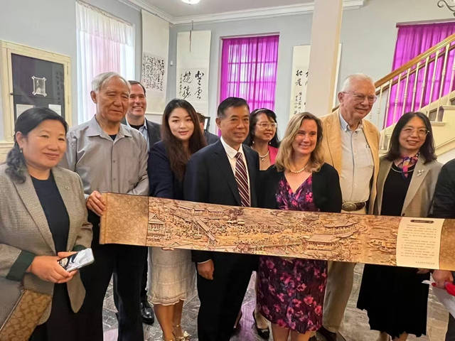 9、2025年5月28日中国驻美国大使馆举办“我的中国相册——我的中国足迹”影片首映会暨现代化的中国体验活动上,师帅博士向与会嘉宾展示了纪智补全版清明上河图。