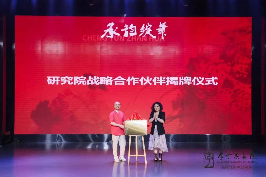 李可染画院海派花鸟画研究院执行院长颜寅和海派花鸟画研究院美龄创研基地余红霞共同进行揭牌