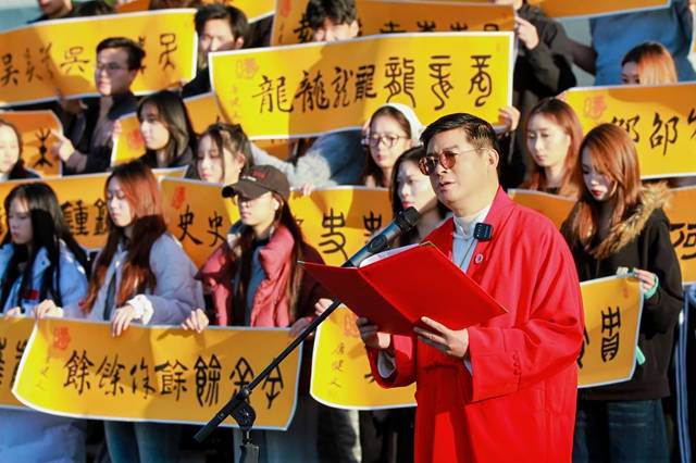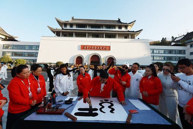 当日下午,武当国际武术学院内洋溢着青春的气息。在这里,百名学子献上了精彩的武术——武当剑和太极拳表演。唐健文发表了“世界和平缘”主题演讲,并将亲笔书写的大爱之“缘”书法作品赠予学院永久收藏。宋佳老师用镜头记录下这些珍贵时刻,她的热情参与也感染了现场师生,不少学生纷纷请求合影,展现了文化传播者与青年学子之间的温馨互动。