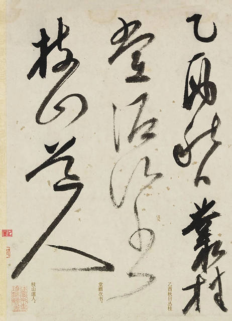 “宋四家”之一的黄庭坚行书纸本《赠张大同卷跋尾》,亦称《为甥张大同书卷》。书于元符三年(1100年)正月,钤有“绍兴”“内府书印”等印记。这件作品是现存仅有的五件黄庭坚大字行书墨迹之一,堪称其书法艺术生涯的巅峰之作。其笔法展现出他沉着凝定的运笔控制与细微而紧绷的笔势,这些特质共同造就了字形中修长而富于张力的笔画。