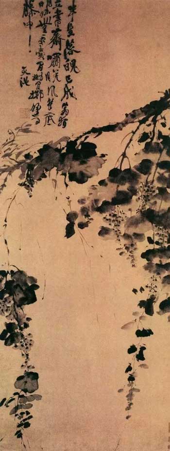 也正因为徐渭画画的目的是发牢骚,他的画中处处似一个狂人在发泄他的不满情绪,所以画得像不像,对徐文长来说并不重要。叶子和葡萄都画得十分粗疏,乍一看,简直不知道是什么东西。而且构图也好像没有任何道理,非常的随便,既不讲究画面的平衡,也不讲究枝,叶,根的稳妥。葡萄的枝干硬生生插进画面上,没有来历,也没有去向。好象是自由生长大庭院里的空气,让人摸不着边际,却又能紧紧地依附着艺术的灵魂!最有韵味的是那首诗,虽然字迹很野蛮,只顾顺着笔画写,笔墨间仿佛一个疯子的呓语,字与字之间、文字与画面形象之间完全没有呼应。看起来是胡乱涂写,但点画非常生动,让人在数百年后似乎还能听见他的笔划过纸面的声音。仿若狂风抢地,横扫千军。他的行草字势欹斜跌宕,令人联想到画家不平的人与经历。